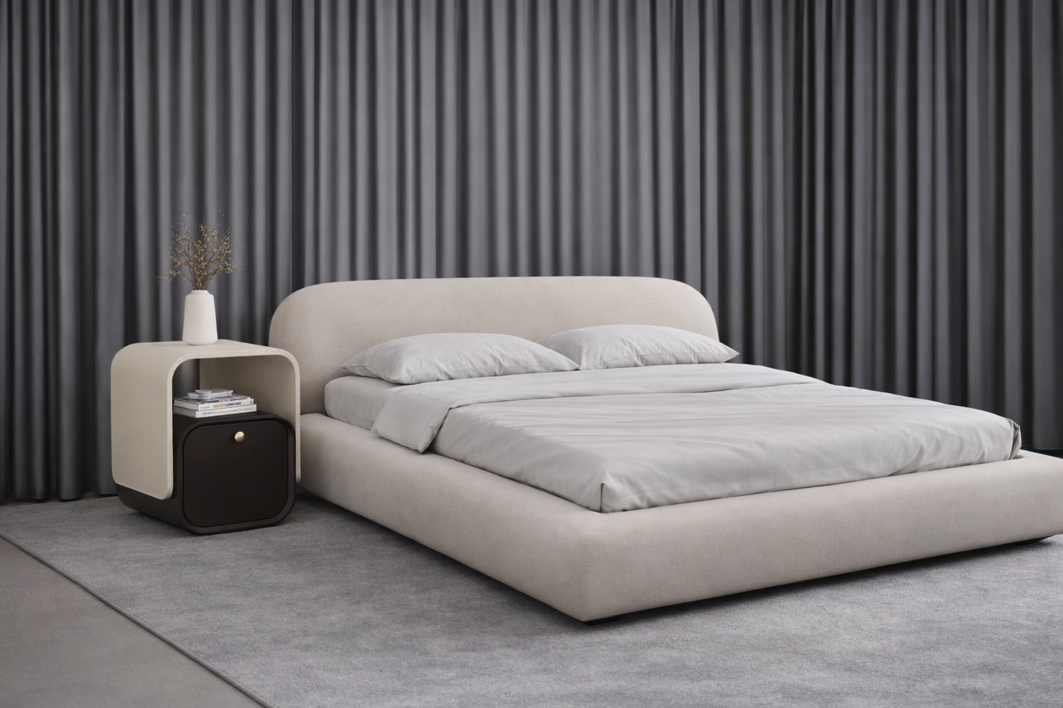 Matching Side Tables: Includes two bespoke side tables with fabric-wrapped outer frames that perfectly match the bed's upholstery, creating a seamless visual flow.