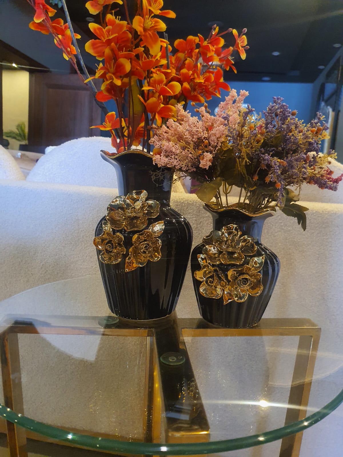 Ceramic Vase Black and Gold are available in a set. When placed in the living room, it adds an elegant and high-quality touch; when placed in the office, it exudes prestige. This vase is suitable for indoor decoration in various spaces such as the living room, bedroom, desk, and dining room, and also makes for a great holiday gift. The unique sculpture makes for an ideal and appealing gift for everyone, regardless of age or gender. Both adults and children would appreciate this sculpture as it adds a touch of class to their living or working spaces.