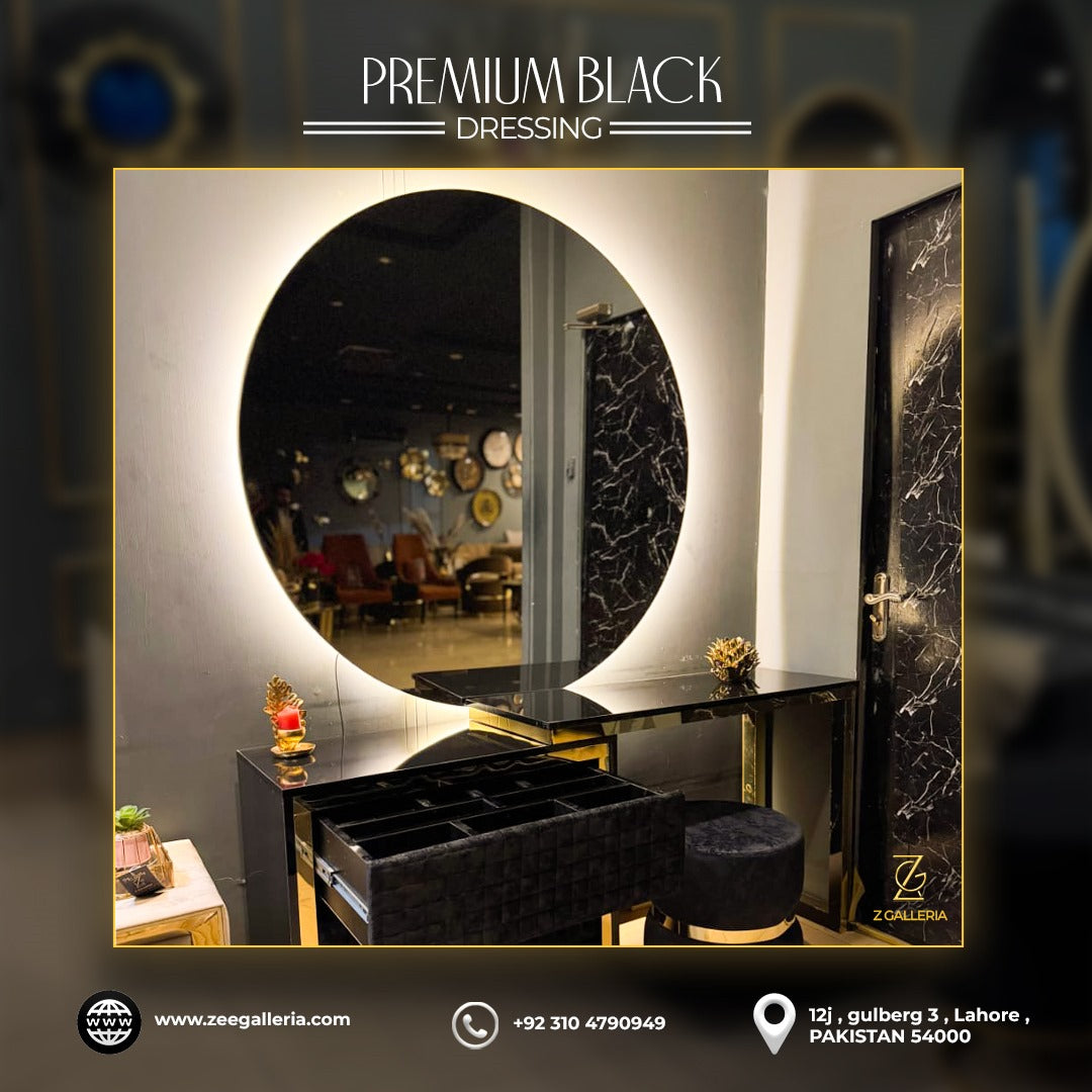 Black Mirror: Luxury meets style with its premium structure and unique design, featuring LED lights rounded its edges, adding a touch of modern sophistication.