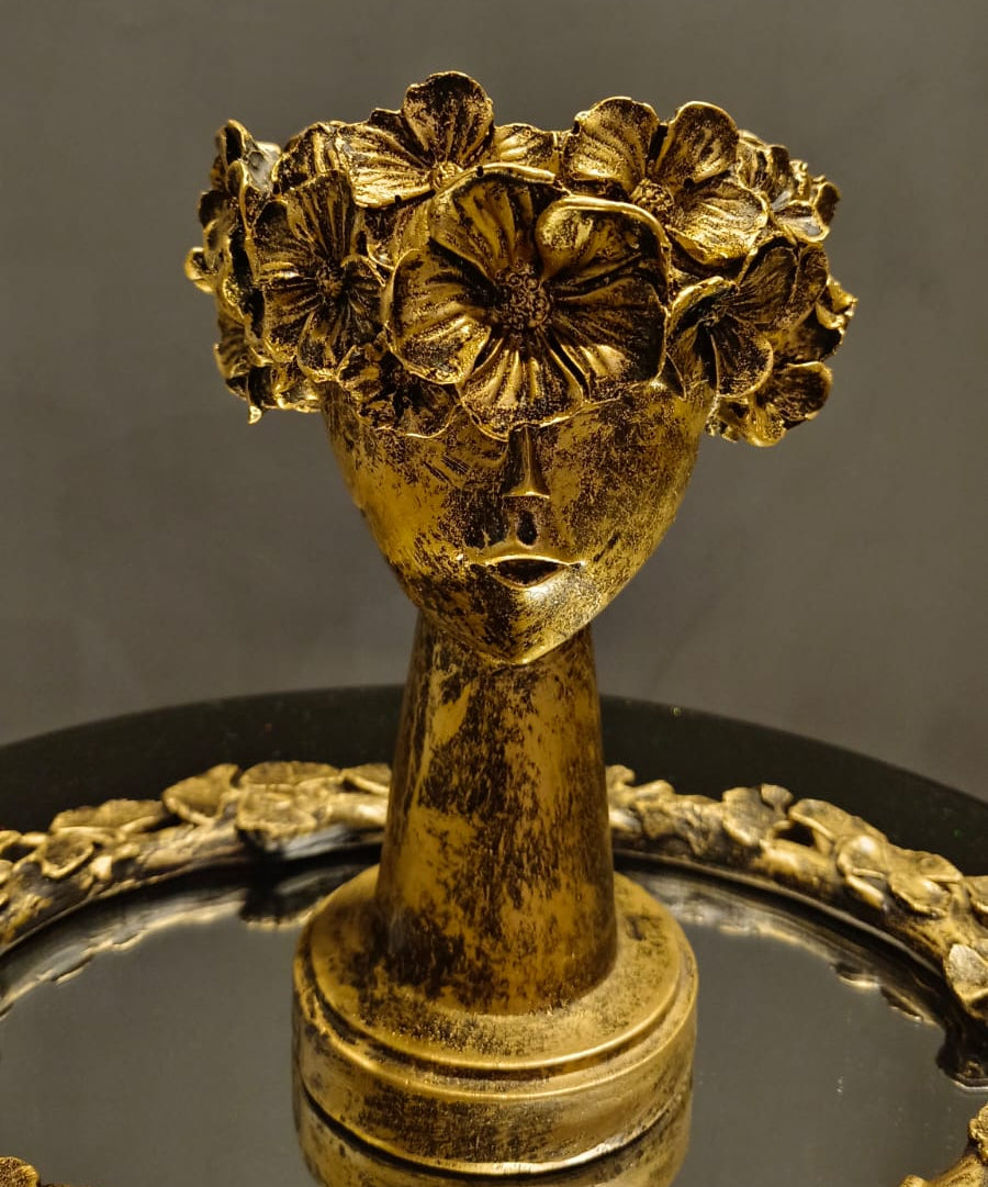 Golden Floral Bust Sculpture This striking decorative piece combines classical bust proportions with contemporary floral artistry. Crafted with meticulous attention to detail, the sculpture features an elegant profile adorned with delicate botanical elements that cascade across the surface. The warm golden finish creates a luminous quality, making it an ideal focal point for modern interiors, gallery spaces, or curated collections. Perfect for those seeking to elevate their décor with a sophisticated blend of traditional sculpture and artistic innovation. A versatile statement piece that complements both minimalist and eclectic design schemes.