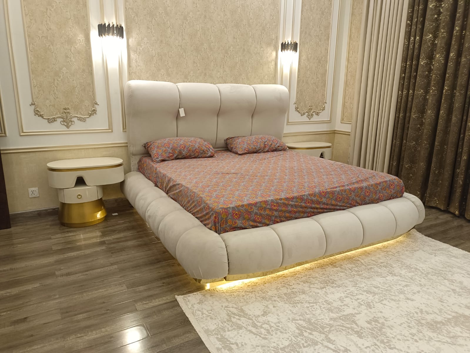The Luxe Cloud Bed is a luxurious and dreamy centerpiece that brings comfort and elegance to any bedroom. With its soft, cloud-like mattress and plush upholstery, it offers unparalleled relaxation. Paired with matching side tables, featuring sleek designs and convenient storage, this bed set combines functionality with sophistication. The accompanying dressing table adds a touch of glamour, with its chic design and ample space for cosmetics and accessories. Together, these pieces create a serene and opulent environment, perfect for modern living spaces