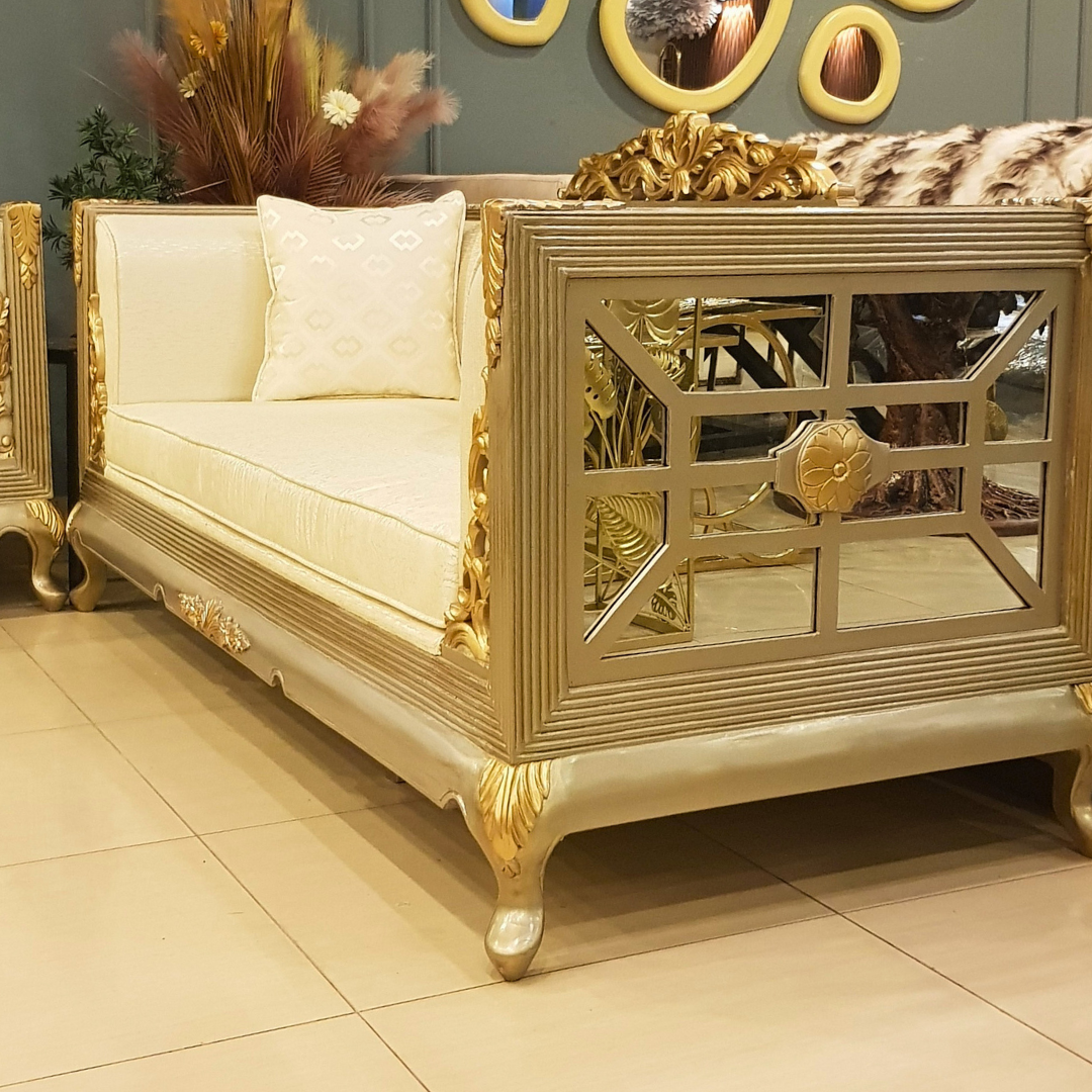 Indulge in luxury with our Royal Classic Sofa Set. The 3-seater sofa comes with mirrors on its arms, adding a touch of elegance to your living room. Made with high-quality velvet upholstery, a sturdy solid wood structure, and comfortable Molty foam, this sofa is the perfect combination of style and comfort. Upgrade your home décor and impress your guests with this exquisite piece of furniture. Order now and experience the ultimate luxury.