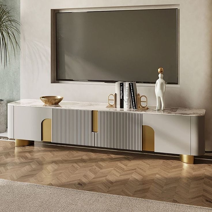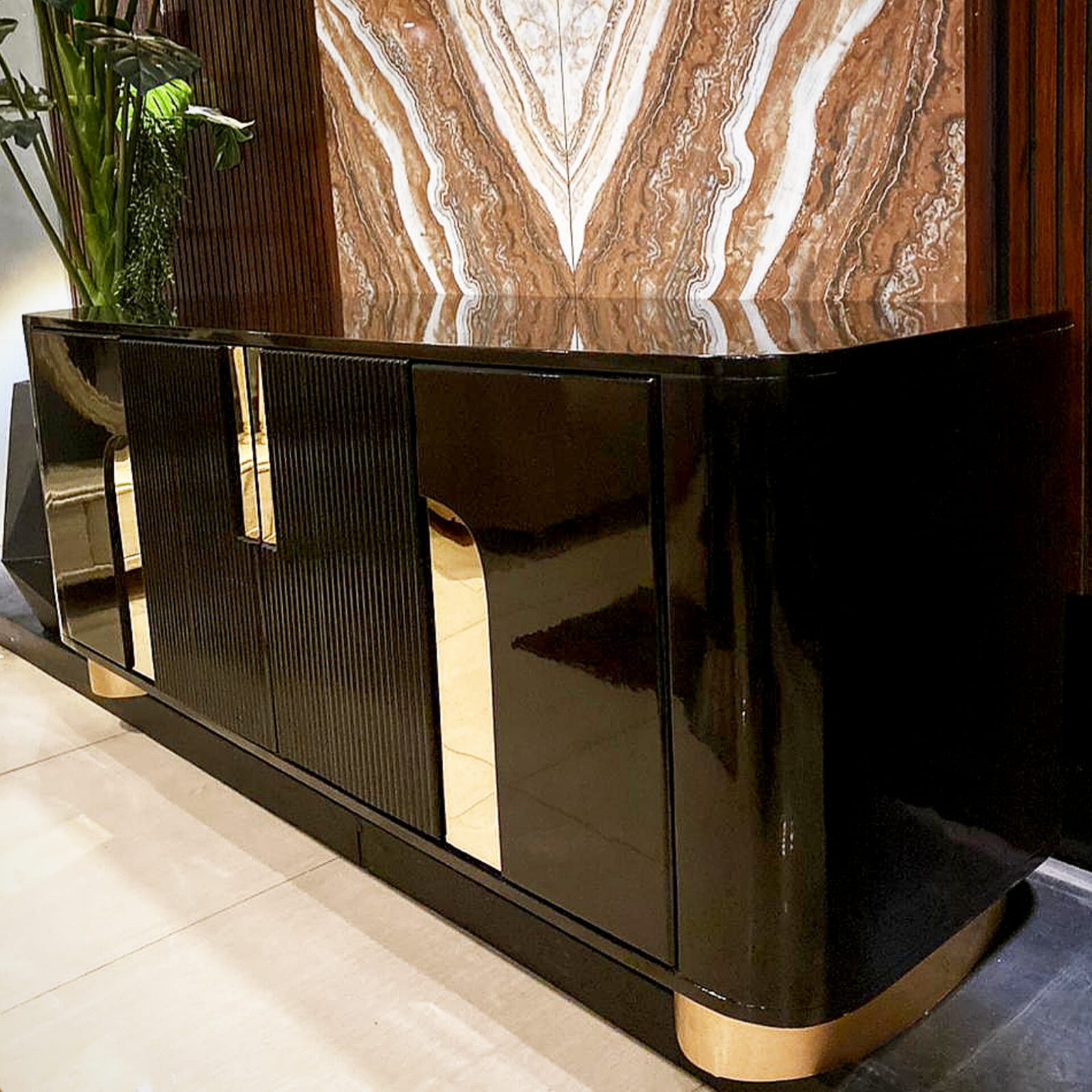 Crafted from premium materials, the console's clean lines and high-gloss finish add modern luxury. It features open shelving for easy access to electronics, and hidden compartments with soft-close doors to conceal cables and clutter. Adjustable shelves allow customizable storage, making it a versatile solution for organizing media and decorative items.