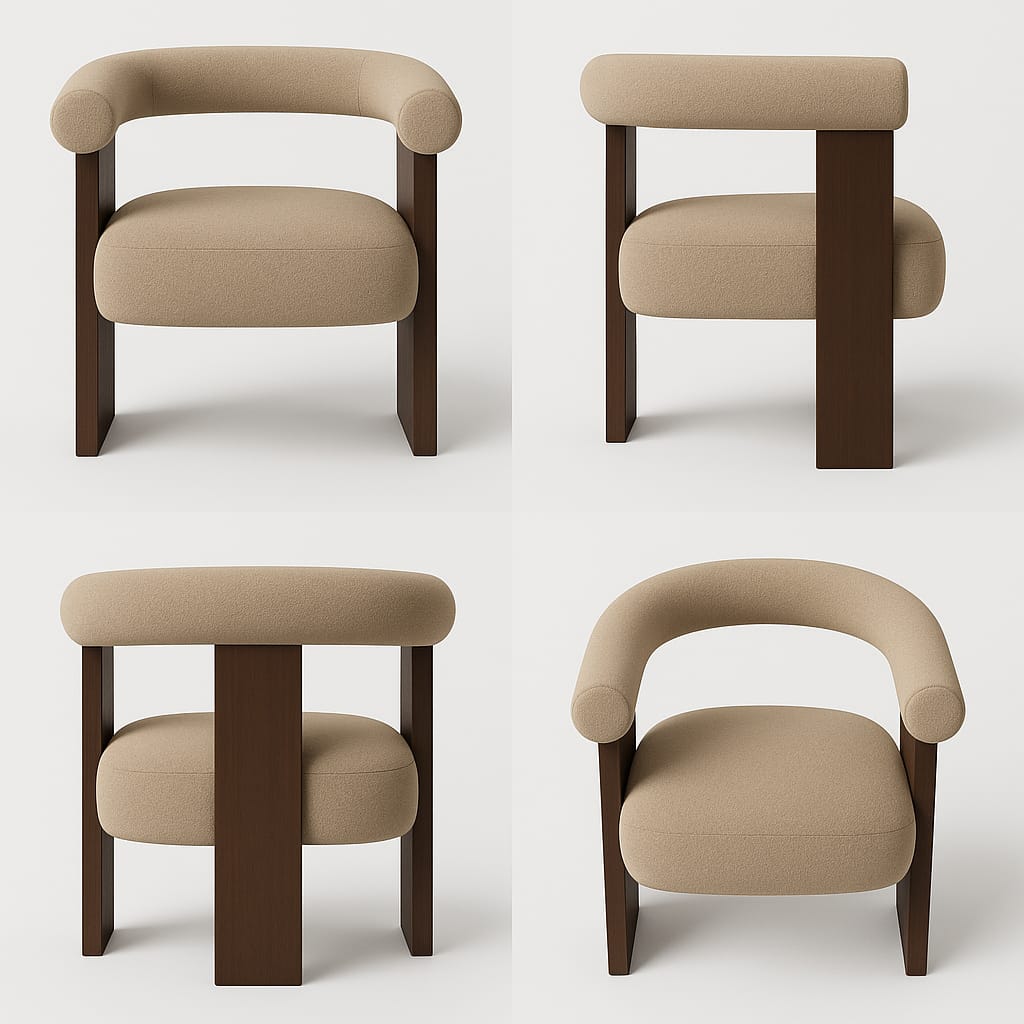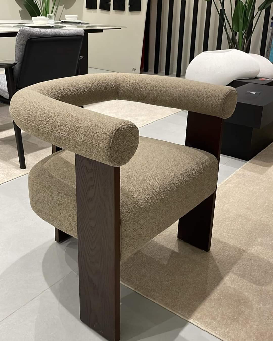 Elevate your space with the refined simplicity of the Z Arc Luxe Chair—a modern statement piece that fuses sculptural elegance with everyday comfort. Upholstered in a soft, boucle-textured fabric, its seamless wraparound backrest and arm design offer ergonomic support and a visually striking silhouette. Anchored by solid wood vertical legs in a rich walnut finish, the chair brings architectural depth to any setting—be it a contemporary lounge, stylish dining room, or creative workspace.