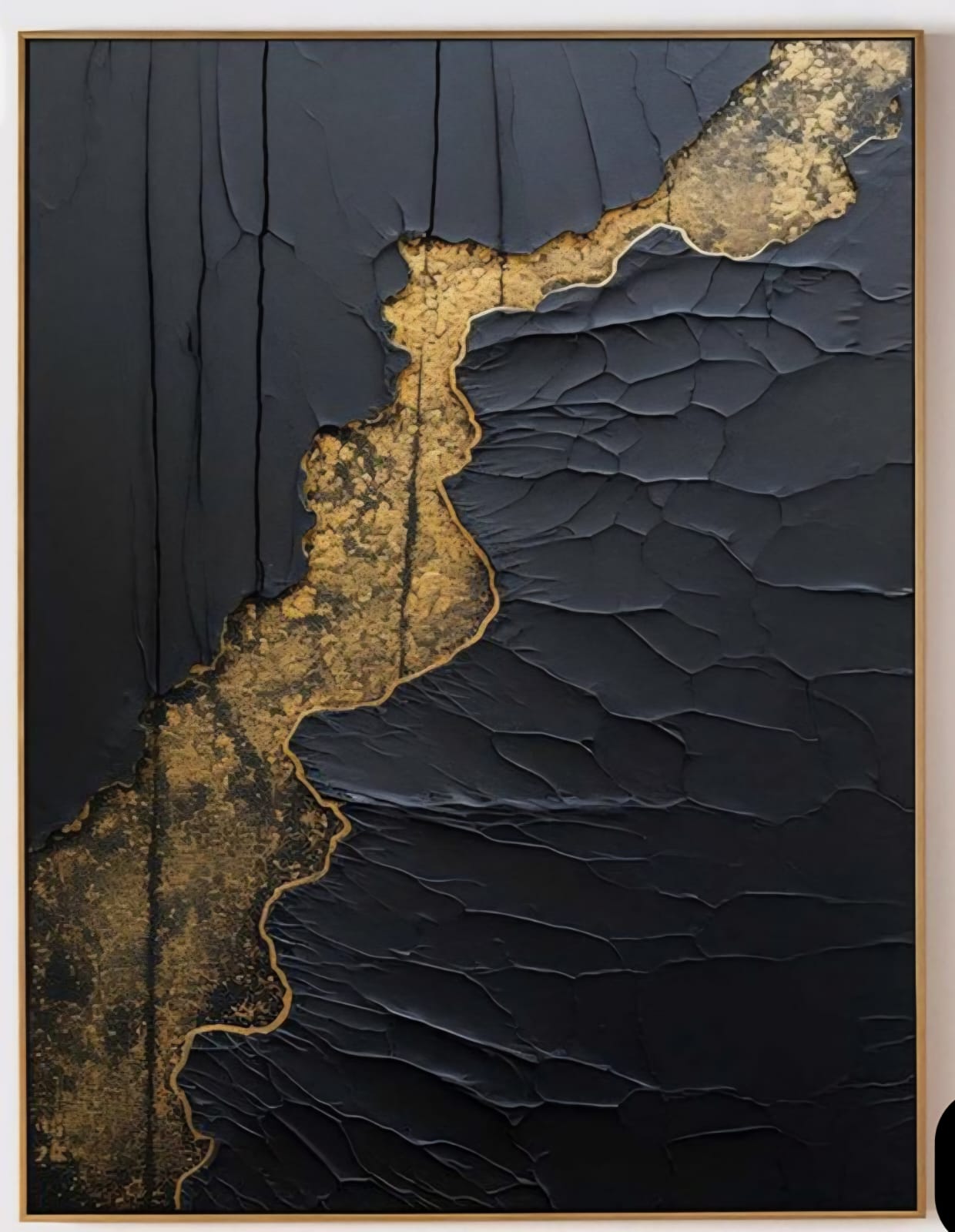 The black surface appears layered and weathered, with subtle cracks, ridges, and knife-like textures that create depth and movement, almost resembling dried earth or flowing stone. Cutting through this darkness is an irregular vein of antique gold, rich in texture and granular detail, evoking the look of natural mineral deposits or kintsugi-inspired repair. The gold line is imperfect and raw, enhancing the sense of authenticity and craftsmanship.