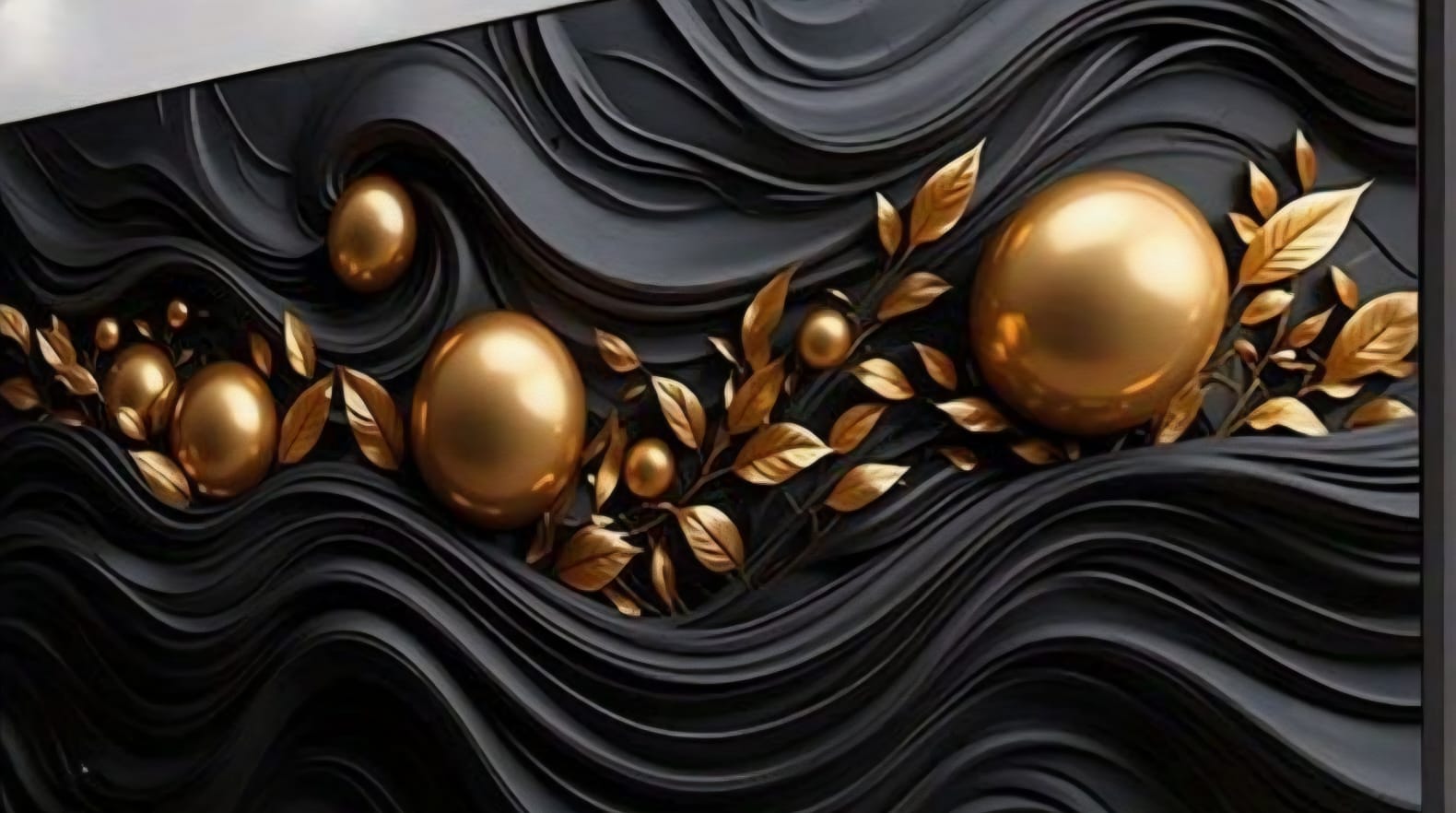 Nestled within the waves are gold metallic spheres and delicately detailed gold leaves, meticulously crafted to add contrast and refinement. The metallic gold elements catch the light beautifully, creating a rich interplay between soft shadows and reflective highlights. The leaves introduce an organic elegance, while the spherical forms symbolize balance and continuity.