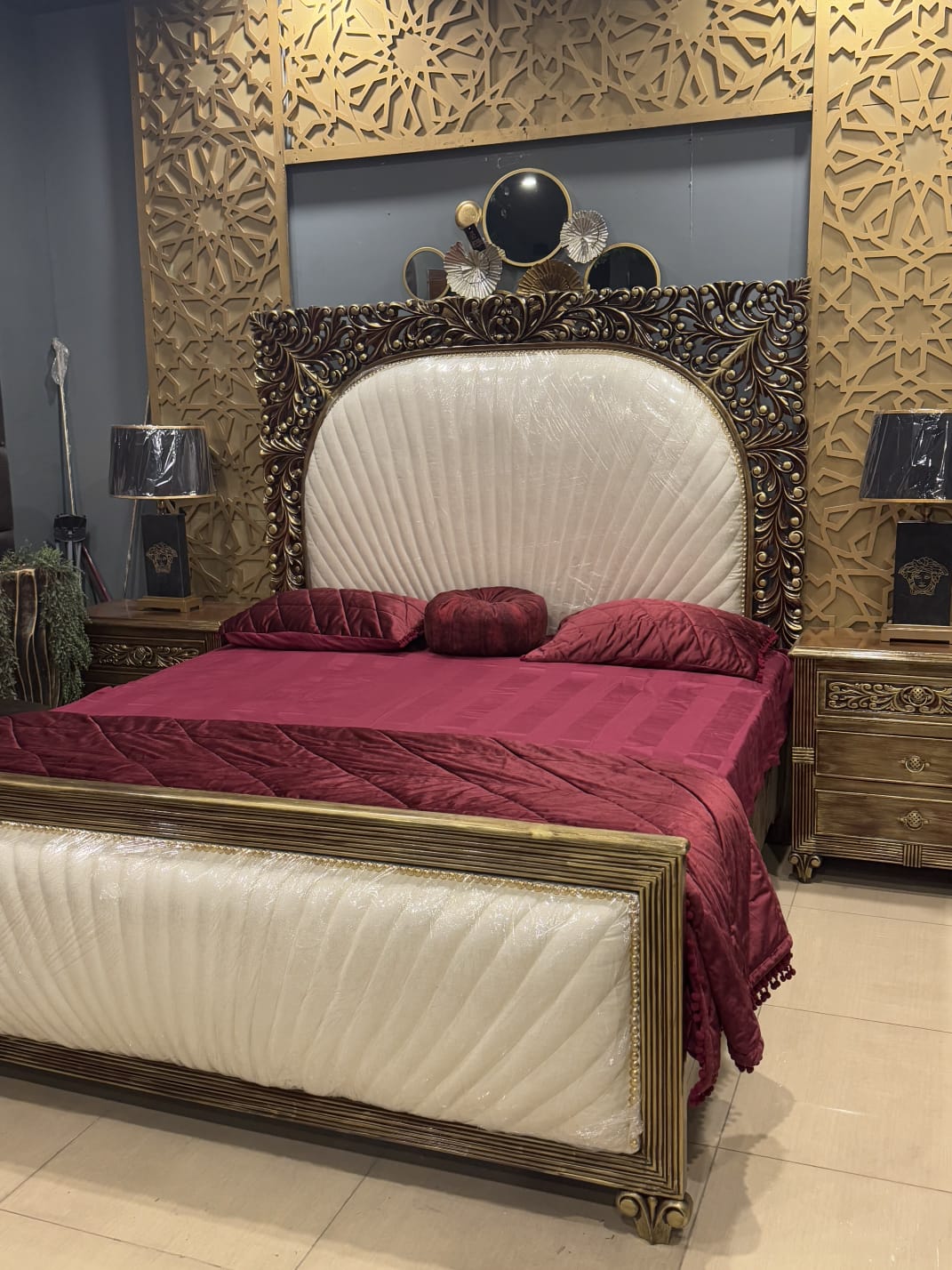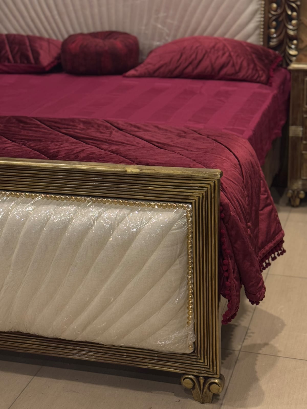 Experience the luxury of our solid wooden (Sheesham) bed with elegant velvet upholstery, complemented by matching solid wood side tables.