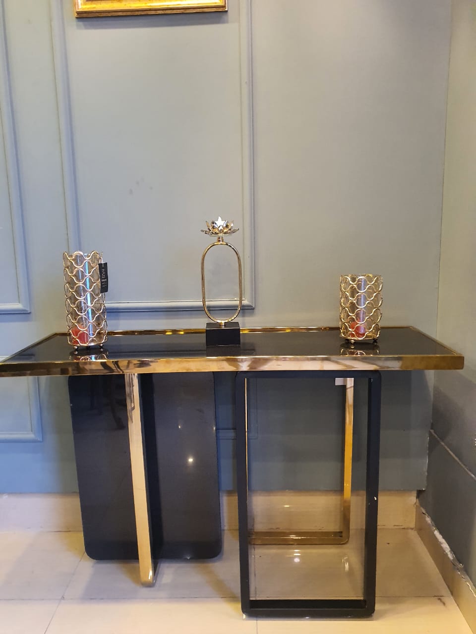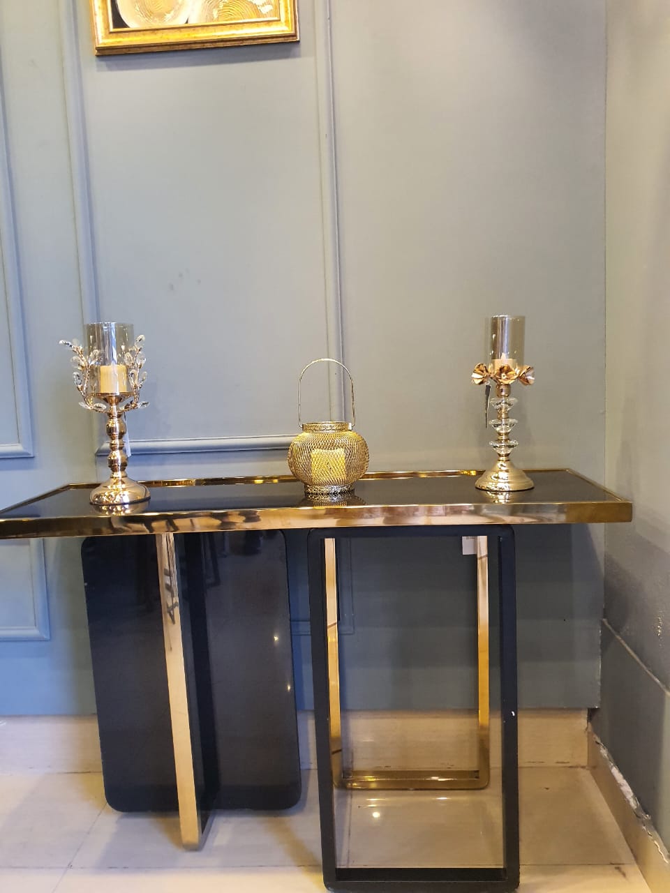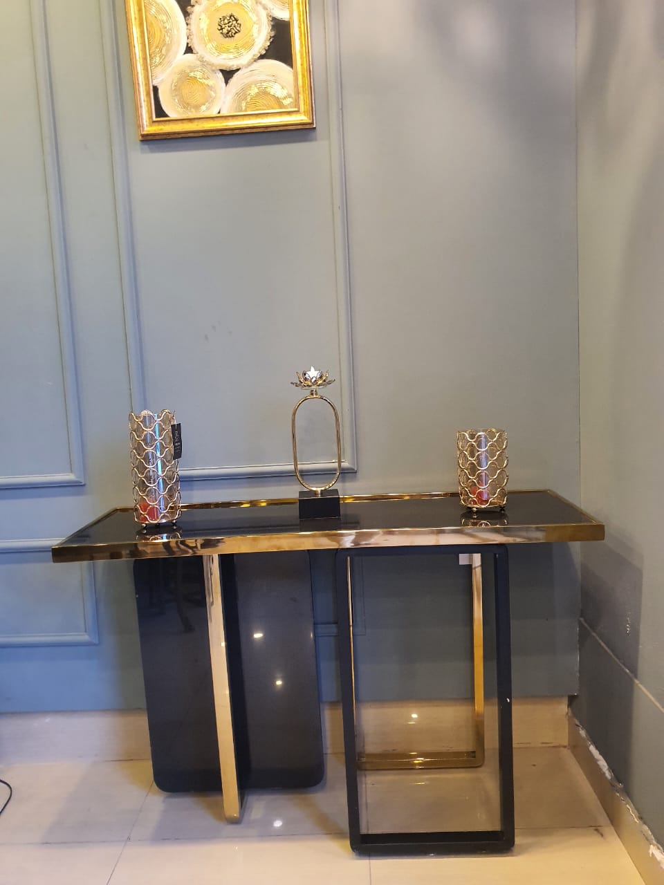 Magnificently crafted SS strip console table carved with marble that gives you that classic Romanesque look combining with a modern touch. An ideal addition to your lobby or reception area