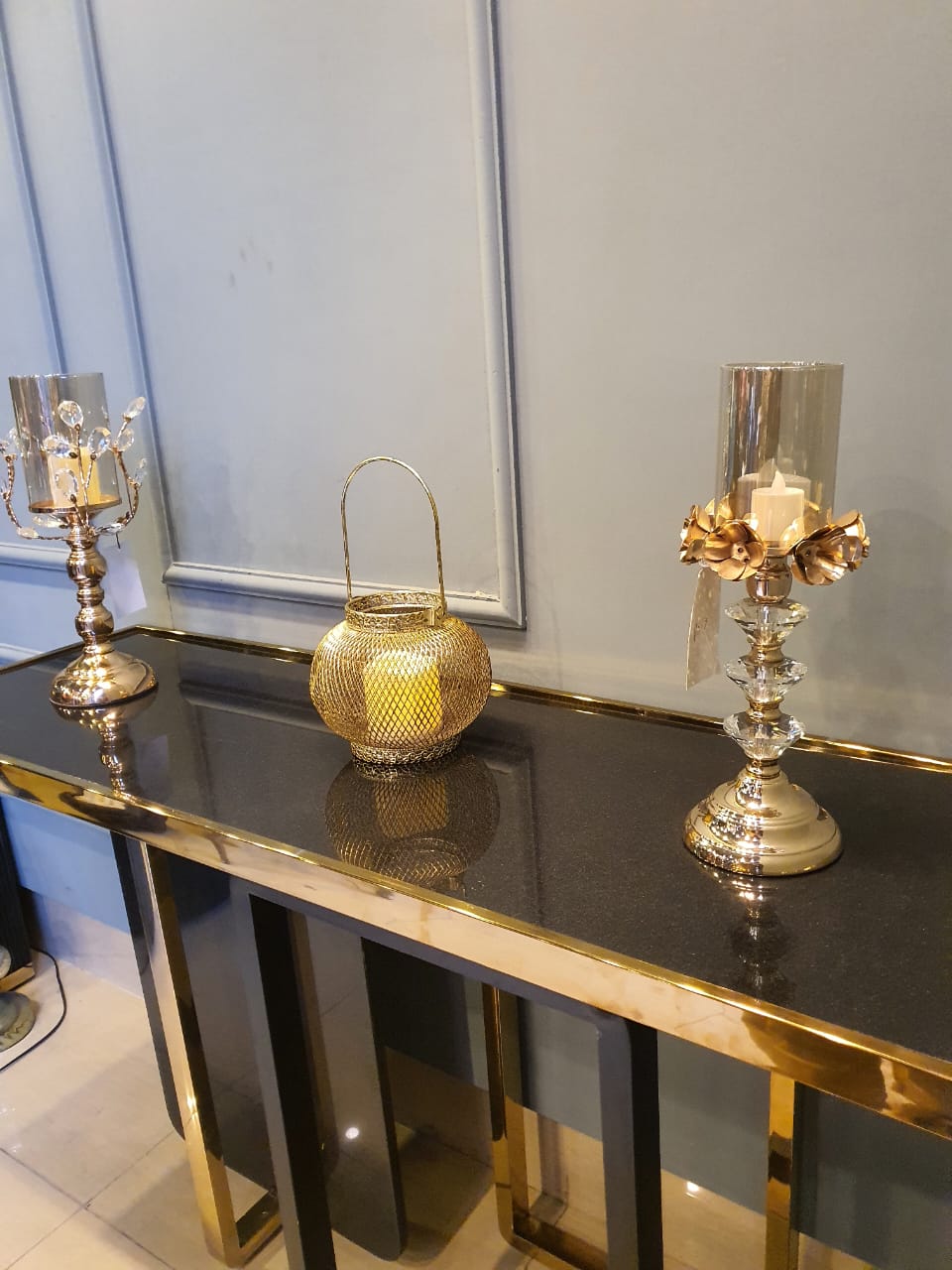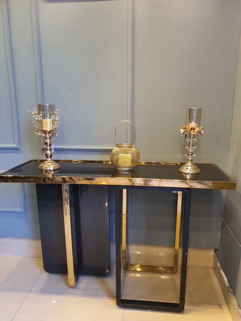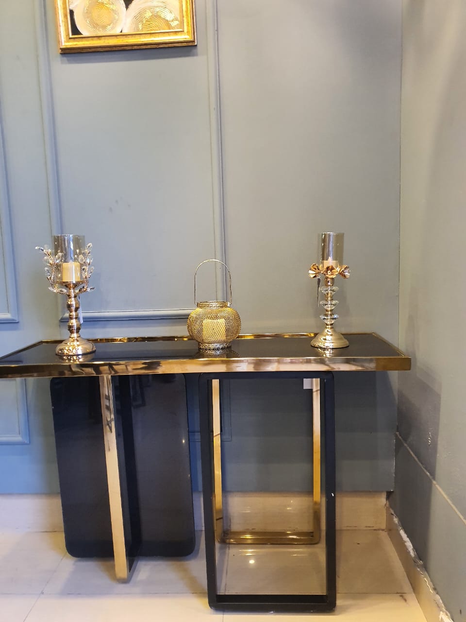 Magnificently crafted SS strip console table carved with marble that gives you that classic Romanesque look combining with a modern touch. An ideal addition to your lobby or reception area
