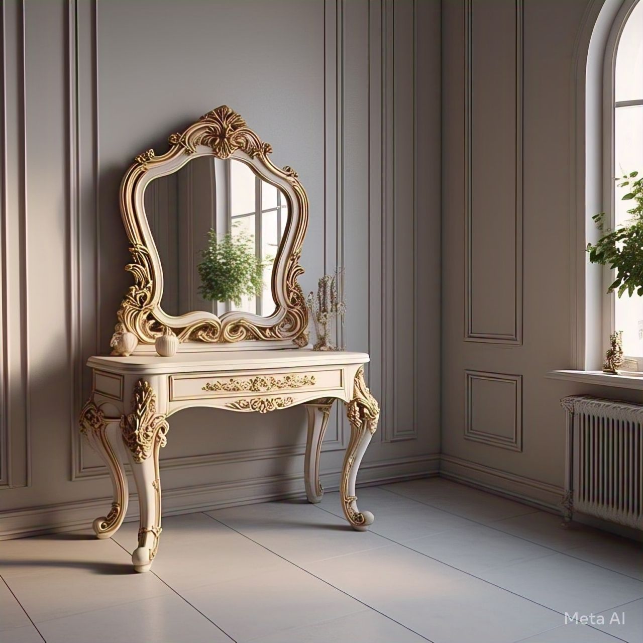 This exquisite traditional bed set is a masterpiece of elegance, featuring a majestic white base adorned with intricate golden carvings that showcase timeless craftsmanship. The headboard, grand and ornately detailed, is designed with rich gold embellishments, reflecting the opulence of classic European and Mughal-era designs. The bed frame, elegantly structured, carries the same luxurious gold detailing, seamlessly blending with the matching side tables and dresser. The side tables feature gold-carved edges and antique-style handles, adding a regal touch to the ensemble. Every element of this bed set radiates royalty and sophistication, making it an ideal choice for those who appreciate classic luxury and intricate artistry. The combination of white and gold enhances the grandeur while maintaining a bright and airy aesthetic, perfect for a luxurious and timeless bedroom setting |